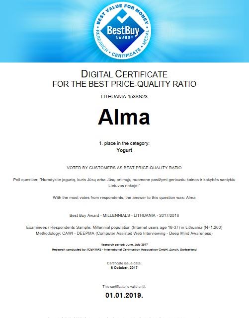 Jogurtas ALMA pripažintas geriausiu kokybės ir kainos santykio prasme Lietuvos rinkoje pagal Šveicarijos organizacijos „ICERTIAS – International Certification Association“ atliktą tyrimą „Best Buy Award 2017/2018“. Tyrime dalyvavo 1200 Lietuvos gyventojų.